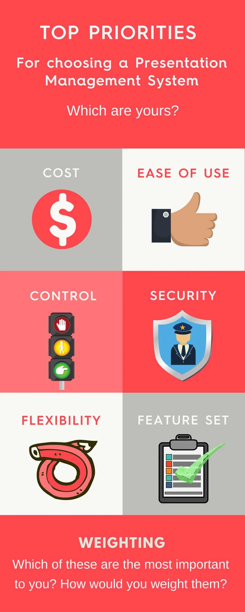 A thorough analysis of these three elements will not only give you clarity and peace of mind, it will also help you to spot the right presentation management system when it comes along.